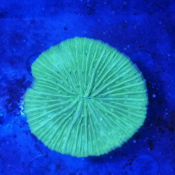 Opis: Koralowiec LPS którego nazwa pochodzi od fungus czyli grzyb co idealnie oddaje jego wygląd. W tym przypadku fungia o idealnie okrągłej tkance oraz płaskim talerzu, drobnymi wypustkami oraz mocno zielonym kolorze. Jest to koralowiec o bardzo delikatnej tkance, który najlepiej czuje się na piaszczystym podłożu. Ciekawą cechą jest możliwość delikatnego przemieszczania się fungi po podłożu. Jak w przypadku innych LPSów odżywia się poprzez zooksantelle ale można ją dokarmiać drobnym pokarmem, najlepiej umieszczonym w pobliżu otworu gębowego. Jest odporna na wahania parametrów wody w akwarium dlatego zaliczamy ją do korali prostych, jednak jak wszystkie LPS zalecamy do stabilnych zbiorników. Nie lubi bezpośredniego sąsiedztwa innych korali ponieważ może paść ofiarą poparzenia ale sama też być zagrożeniem.