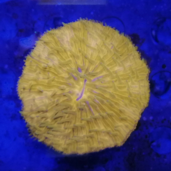 Opis: Koralowiec LPS którego nazwa pochodzi od fungus czyli grzyb co idealnie oddaje jego wygląd. W tym przypadku fungia o idealnie okrągłej tkance oraz lekko stożkowym kształcie, dużymi wypustkami oraz mocno pomarańczowym kolorze. Jest to koralowiec o bardzo delikatnej tkance, który najlepiej czuje się na piaszczystym podłożu. Ciekawą cechą jest możliwość delikatnego przemieszczania się fungi po podłożu. Jak w przypadku innych LPSów odżywia się poprzez zooksantelle ale można ją dokarmiać drobnym pokarmem, najlepiej umieszczonym w pobliżu otworu gębowego. Jest odporna na wahania parametrów wody w akwarium dlatego zaliczamy ją do korali prostych, jednak jak wszystkie LPS zalecamy do stabilnych zbiorników. Nie lubi bezpośredniego sąsiedztwa innych korali ponieważ może paść ofiarą poparzenia ale sama też być zagrożeniem.