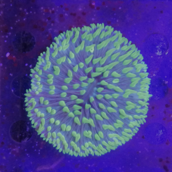 Opis: Koralowiec LPS którego nazwa pochodzi od fungus czyli grzyb co idealnie oddaje jego wygląd. W tym przypadku fungia o idealnie okrągłej tkance oraz stożkowym kształcie talerza, dużymi, jaskrawo zielonymi wypustkami oraz fioletowym talerzu. Jest to koralowiec o bardzo delikatnej tkance, który najlepiej czuje się na piaszczystym podłożu. Ciekawą cechą jest możliwość delikatnego przemieszczania się fungi po podłożu. Jak w przypadku innych LPSów odżywia się poprzez zooksantelle ale można ją dokarmiać drobnym pokarmem, najlepiej umieszczonym w pobliżu otworu gębowego. Jest odporna na wahania parametrów wody w akwarium dlatego zaliczamy ją do korali prostych, jednak jak wszystkie LPS zalecamy do stabilnych zbiorników. Nie lubi bezpośredniego sąsiedztwa innych korali ponieważ może paść ofiarą poparzenia ale sama też być zagrożeniem.