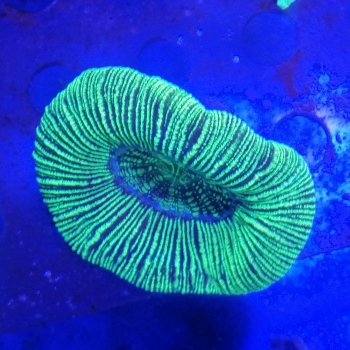 Opis: Trachyphyllia geoffroyi jest to tak zwany koral mózgowy ponieważ swoim kształtem go przypomina. Oferowany egzemplarz ma bardzo okrągły talerz jednak wraz z wzrostem koralowca może się zmienić na bardziej pofałdowany. Dużą zaletą jest niezwykle żywy zielony kolor oraz odznaczające się linie. Jest to bardzo nietypowy koral lps z pewnością dla fanów wyjątkowych okazów w akwarium. jego szkielet przypomina stożek tak jak w popularnej catalapchylli i również najlepiej czuje się na piaszczystym podłożu ze względu na delikatną tkankę. W centralnej części posiada otwór gębowy co oznacza, że jak inne LPS można ją dokarmiać np. drobnymi mrożonkami jak plankton zielony lub czerwony. W akwarium powinna mieć zapenioną przestrzeń ze względu na średnią agresywność. LPS łatwy jednak zalecany do stabilnego zbiornika.